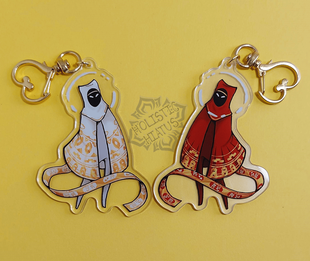 a 3 inch acrylic charm with a two sided print featuring the red cloak on one side and the white cloak on the other